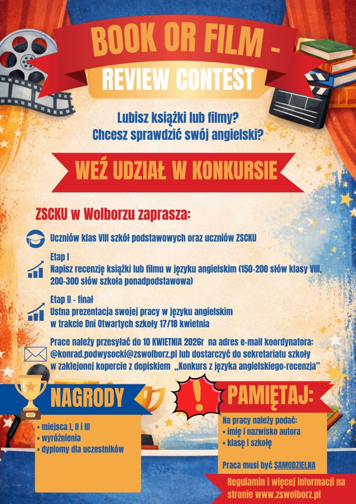 Lubisz książki albo filmy? Chcesz sprawdzić swoje umiejętności językowe i spróbować swoich sił w języku angielskim? To świetna okazja właśnie dla Ciebie! Zapraszamy uczniów klas VIII szkół podstawowych oraz uczniów ZSCKU w Wolborzu do udziału w konkursie na recenzję książki lub filmu w języku angielskim.