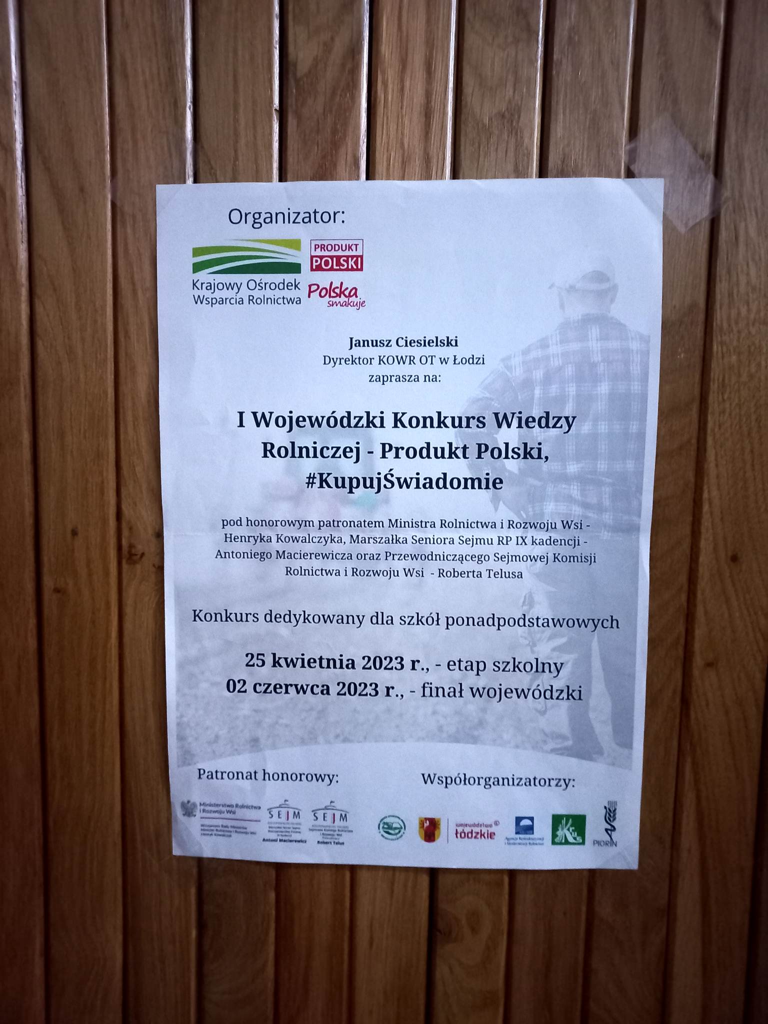 Dnia 25.04.2023 roku w ZSCKU w Wolborzu odbył się „I Wojewódzki Konkurs Wiedzy Rolniczej – Produkt Polski, #KupujŚwiadomie”, którego organizatorem jest Krajowy Ośrodek Wsparcia Rolnictwa (KOWR) w Warszawie, w którego imieniu i na rzecz działa Dyrektor Oddziału Terenowego Krajowego Ośrodka Wsparcia Rolnictwa w Łodzi.