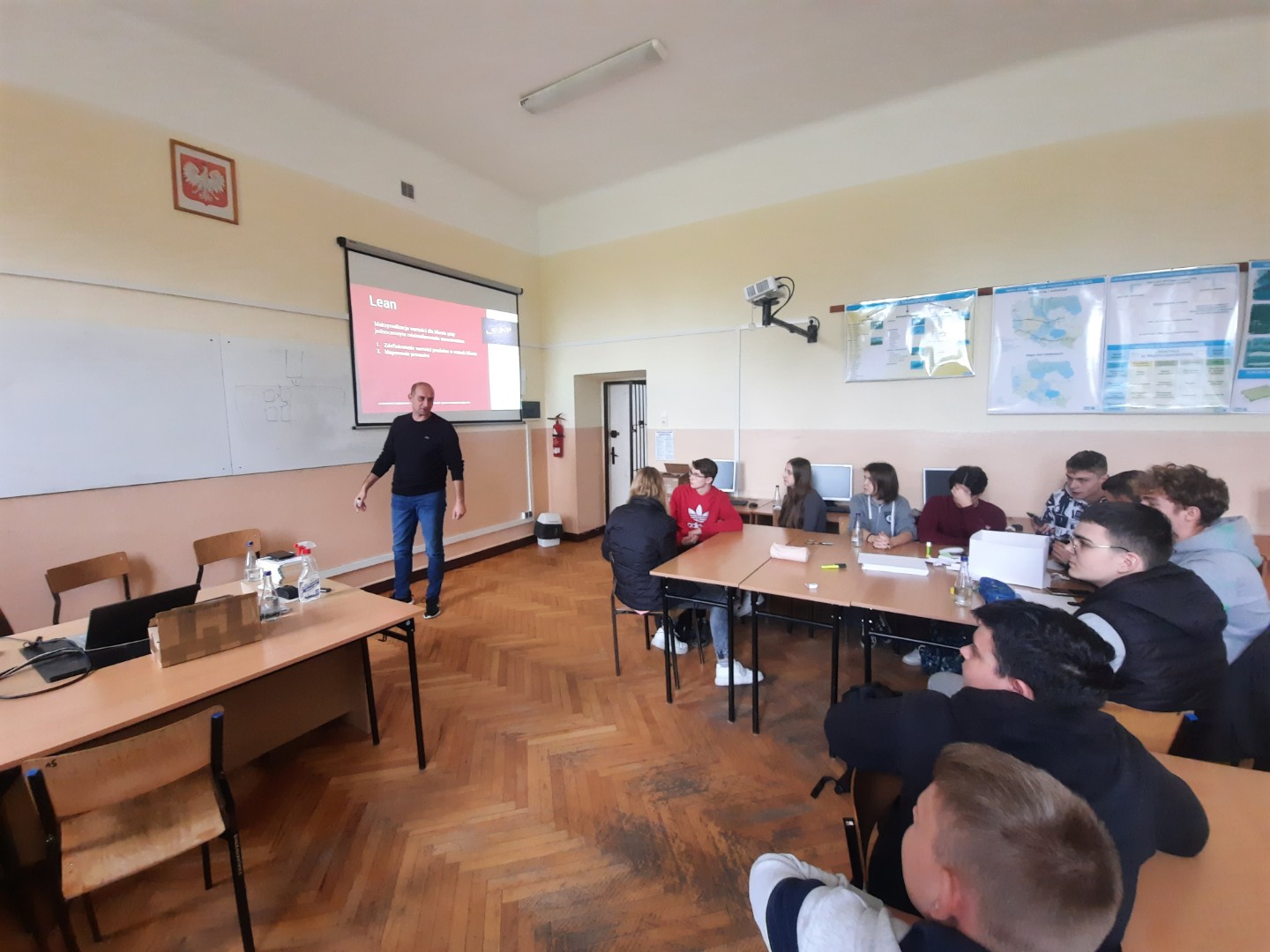 13 listopada 2023 roku uczniowie klas I i II uczących się w zawodzie technik logistyk uczestniczyli w spotkaniu z praktykiem w branży logistycznej, panem Piotrek Jamruszką – dyrektorem transportu w firmie Piast Cargo Transport. Prelekcja poświęcona była pragmatycznemu zastosowaniu łańcucha dostaw w logistyce kontraktowej. Uczniowie w trakcie spotkania zbudowali makietę magazynu oraz aktywnie odpowiadali na zadawane pytania. Ponadto w trakcie prezentacji omówiono możliwości zastosowania koncepcji Kaizen w rzeczywistości logistycznej z uwzględnieniem poszczególnych procesów oraz formułę 5S jako metodę na zaoszczędzenie czasu, poprawę ergonomii i optymalizację środowiska pracy i nauki.