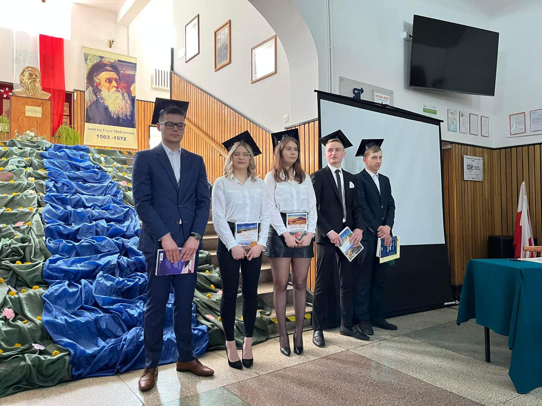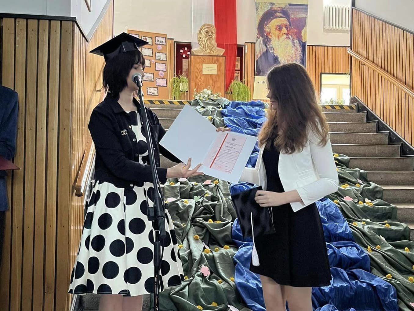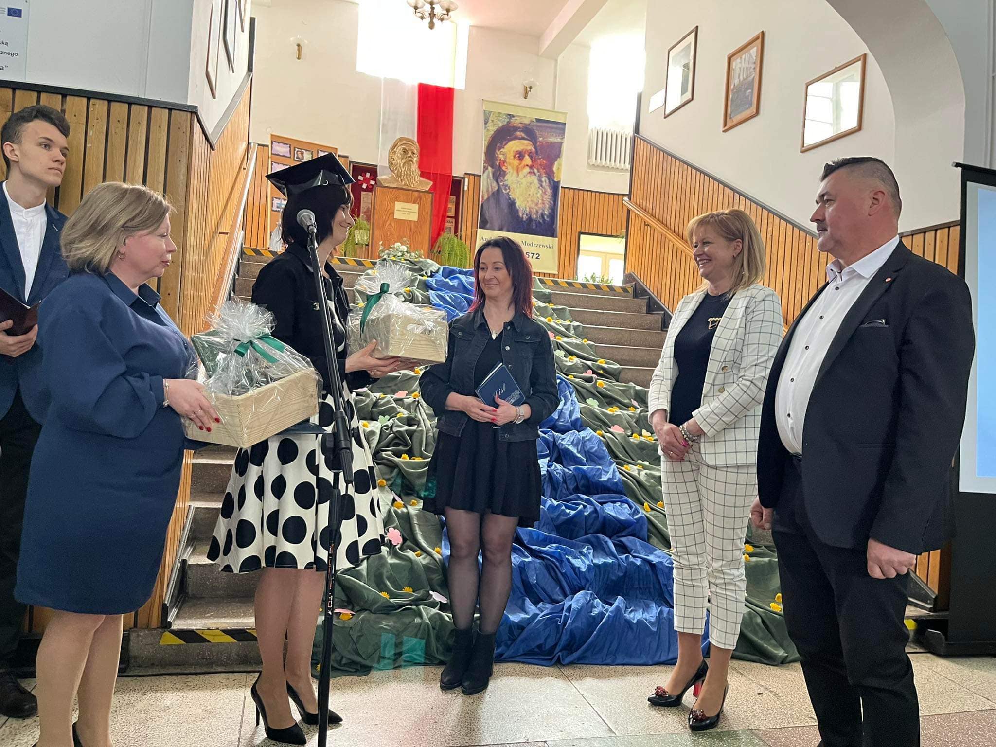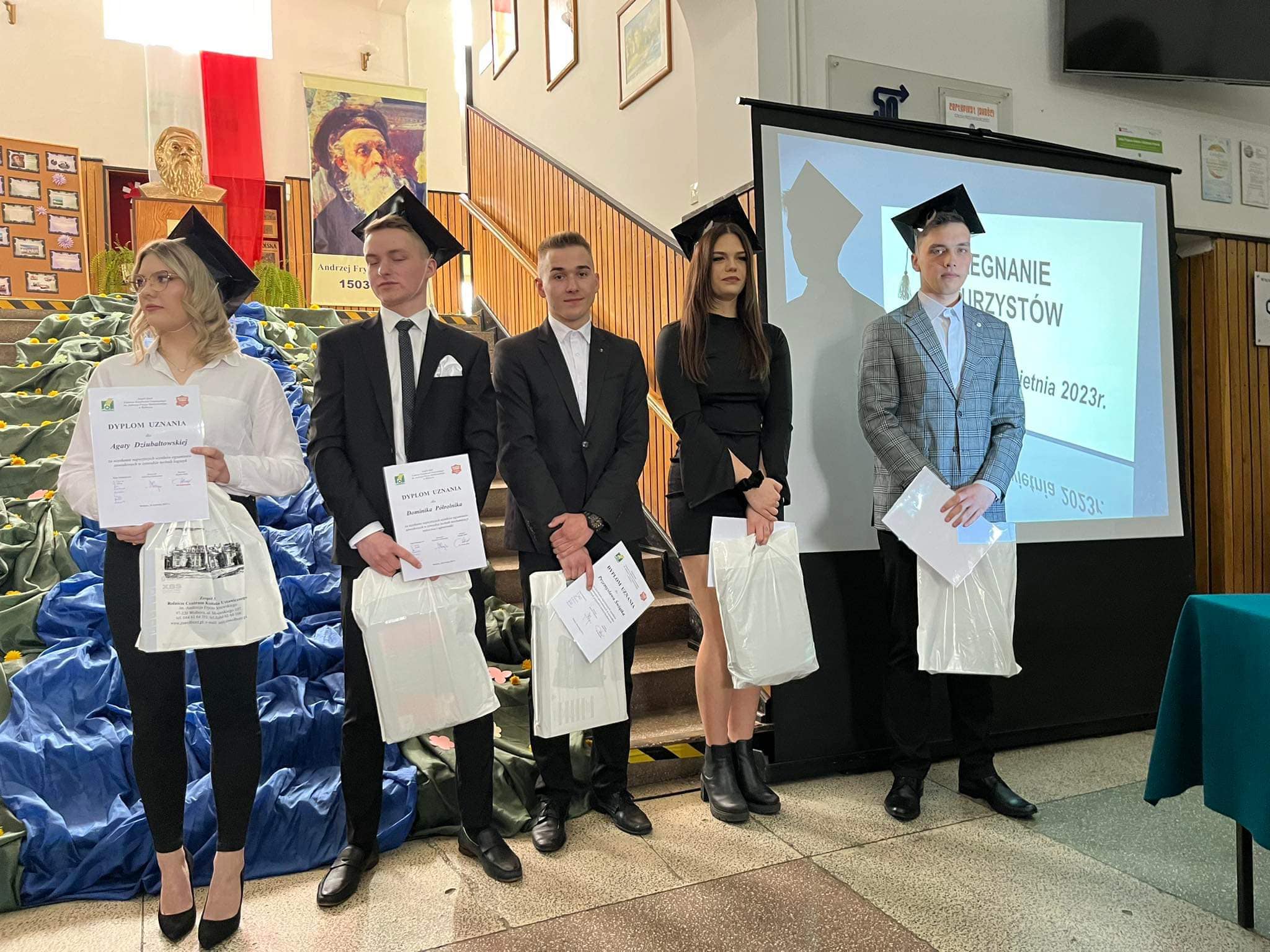 Gabriela Masiarek odebrała również z rąk Pani Dyrektor świadectwo z wyróżnieniem. Tej podniosłej chwili w życiu wszystkich wyróżnionych towarzyszyły gromkie brawa kolegów i koleżanek, nauczycieli oraz przybyłych na uroczystość rodziców abiturientów. Ci ostatni zostali szczególnie docenieni i wyróżnieni przez Dyrekcję Szkoły zarówno za trud wychowawczy, jak i wkład pracy włożony w funkcjonowanie szkoły. Nie zabrakło przy tym podziękowań, ciepłych słów i symbolicznych kwiatów. Liczne nagrody, dyplomy i podziękowania czekały również na pozostałych absolwentów, którzy zyskali uznanie za bardzo dobre wyniki w nauce, wyróżniającą się postawą w rywalizacji sportowej, nienaganne zachowanie oraz bardzo dobre wyniki na egzaminach zawodowych. Po nagrodach i wyróżnieniach przyszedł czas na wzruszające słowa pożegnania. Głos zabrała przedstawicielka społeczności szkolnej Maja Arkuszewska, zaś w imieniu abiturientów wystąpiła Martyna Bebłot. W równie wzruszającej konwencji utrzymana była część artystyczna, która w zamyśle autorów scenariusza i wykonawców miała zachęcać do refleksji i głębszych przemyśleń.